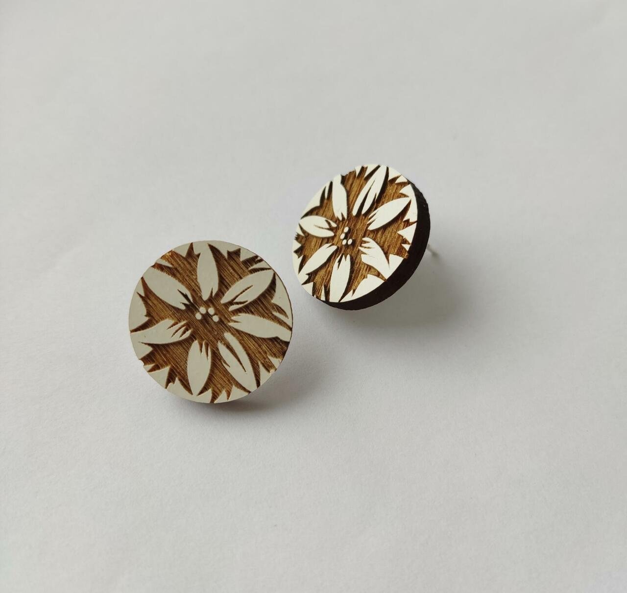 Puidust valged kõrvarõngad. Läbimõõt 20mm. Kinnitused hõbedast (925).