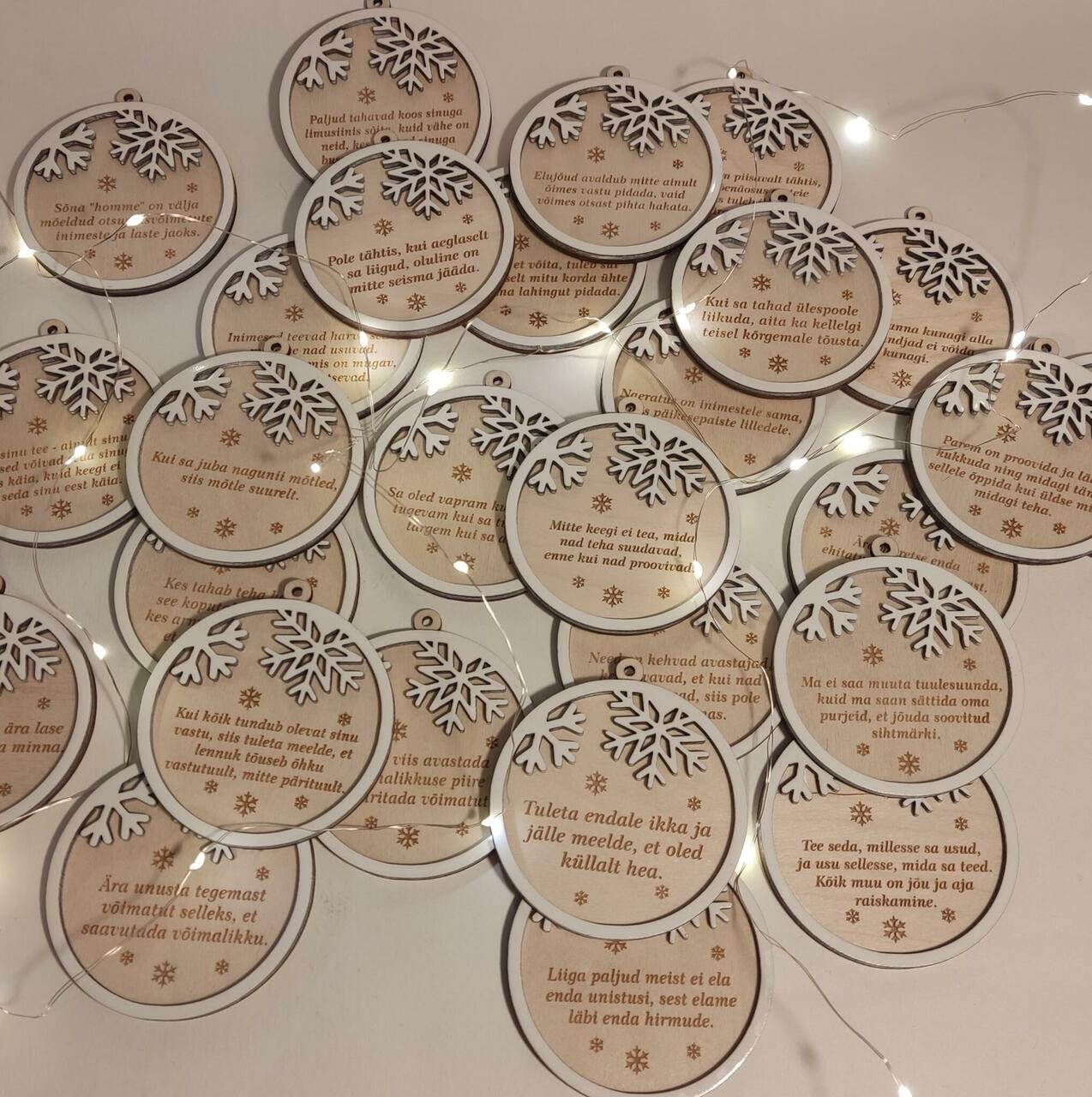 Kahekihiline riputatav puidust jõuluehe. Pealmine valgeks värvitud lumehelvestega raam, taust naturaalne graveeringuga vineer.