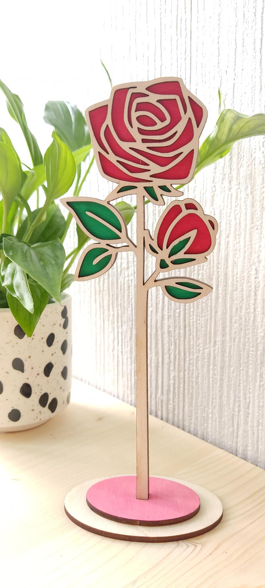 Imeilus ruumiline puidust roos, mis seisab laual püsti.