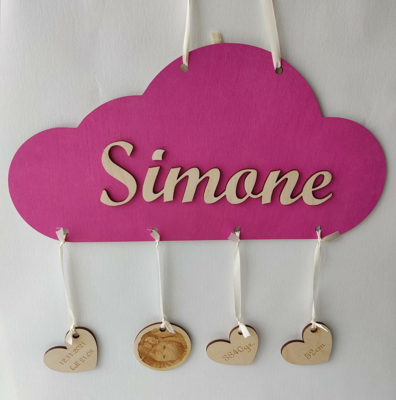 Materjal 3mm vineer. Värvitud lastetoa värviga fuksia roosaks. Pilvele liimitud lapse nimi/nimed.