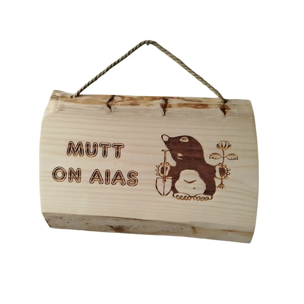 Puidust silt graveeritud pildi ja tekstiga.