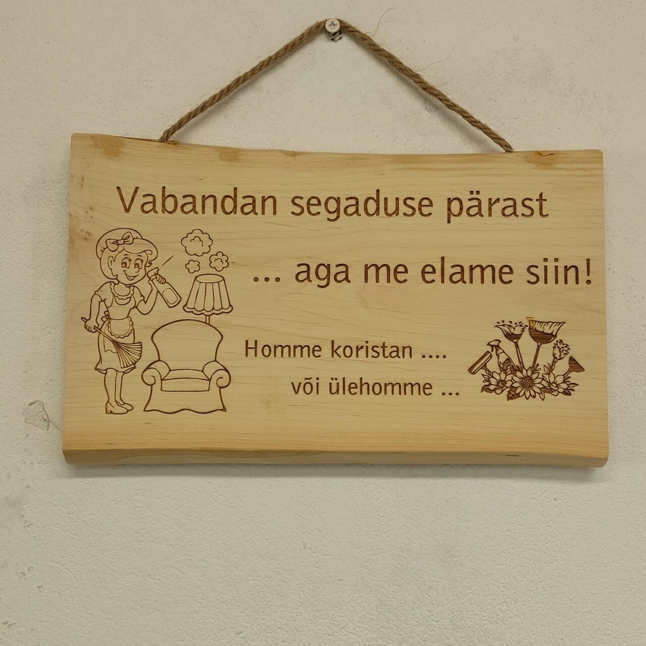 Servamata kase- või lepalauale graveeritud tekst. Sildi riputamiseks takunöör.Pikkus ca 300mm, laius ca 170-190mm.
