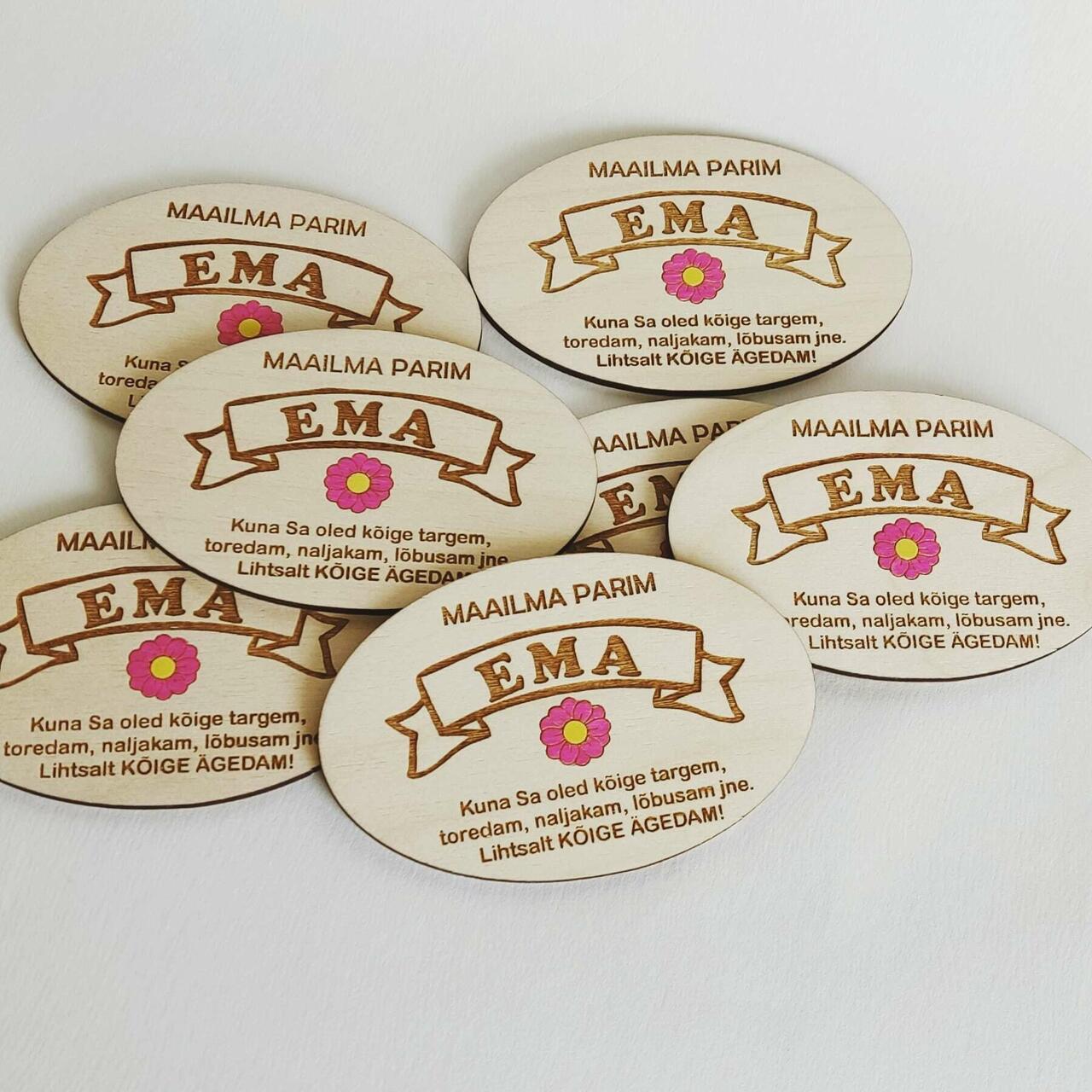 Magnet külmikule kinnitamiseks. Valmistatud 3mm kasevineerist. Tekst peale graveeritud. Lilleke käsitsi värvitud.