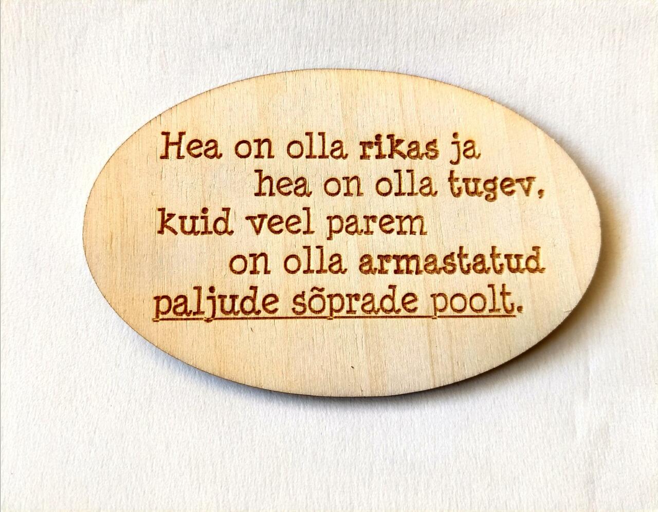 Magnet külmikule kinnitamiseks. Valmistatud 3mm kasevineerist. Tekst peale graveeritud.