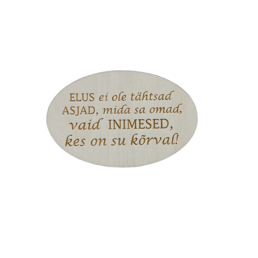 Magnet külmikule kinnitamiseks. Valmistatud 3mm kasevineerist. Tekst peale graveeritud. Mõõt 100x65mm.