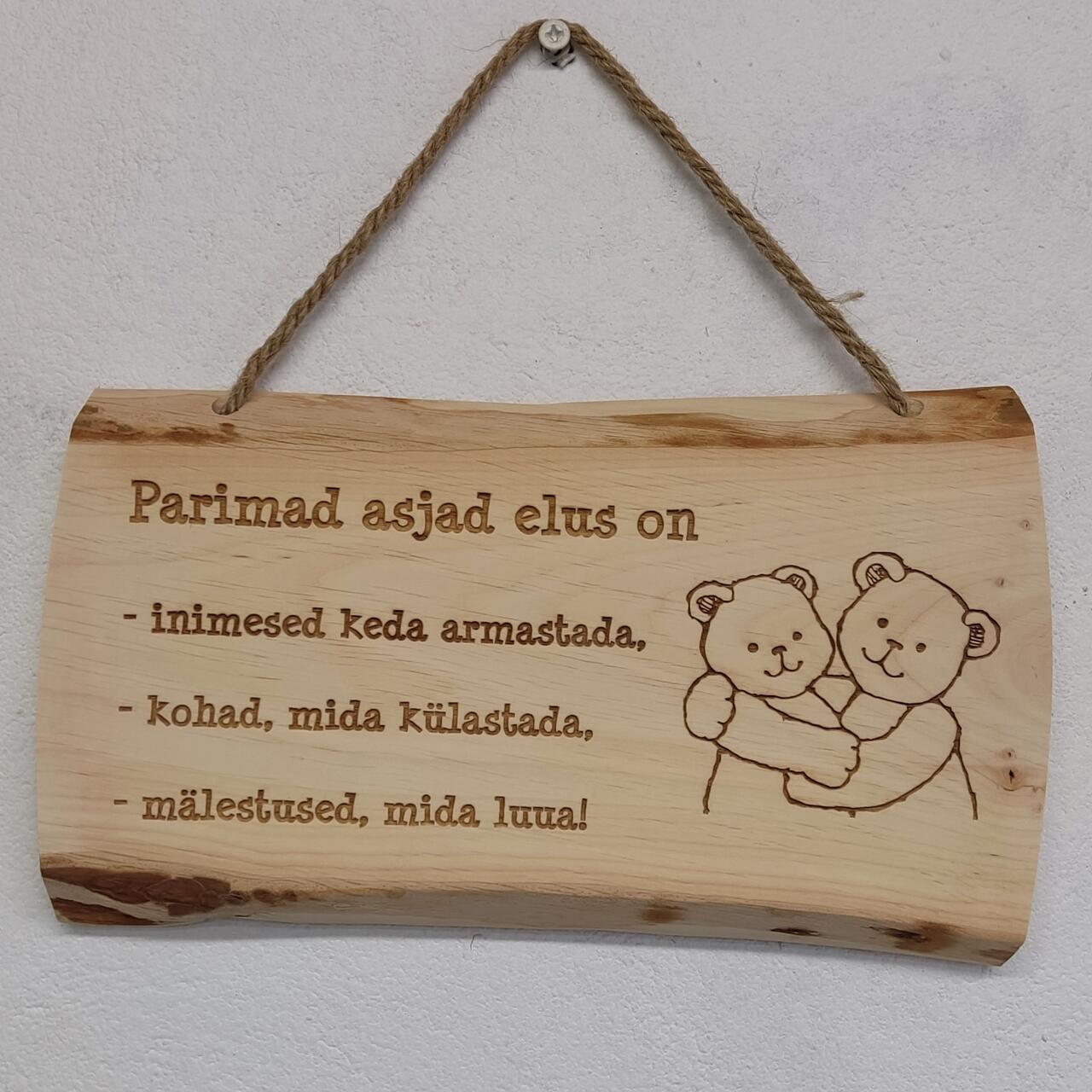 Servamata kase- või lepalauale graveeritud tekst. Sildi riputamiseks takunöör.Pikkus ca 260mm, laius ca 130-180mm.